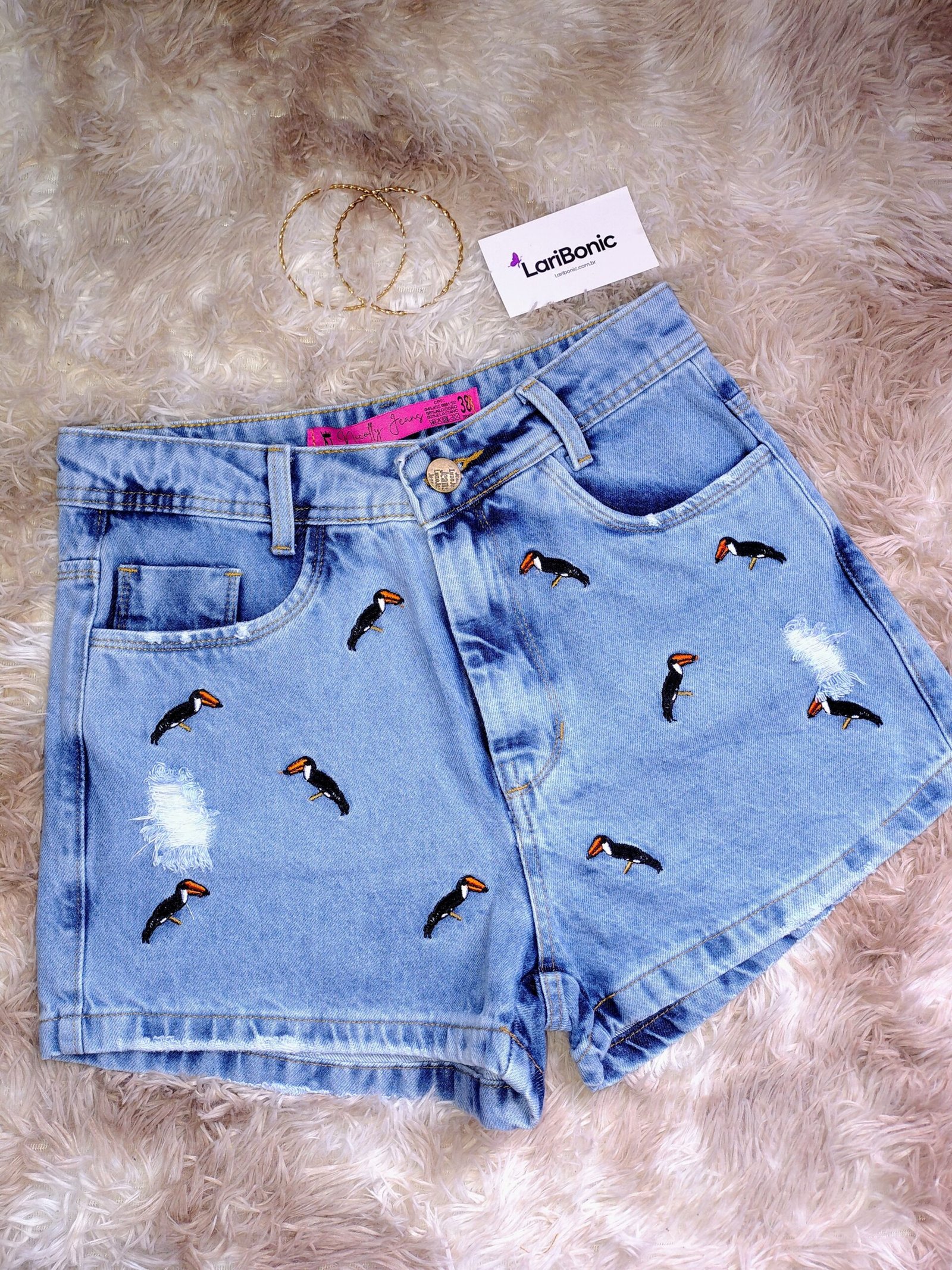 Short Jeans Bordado Mini-Tucano – Estilo e Conforto com Lavagem Clara Premium